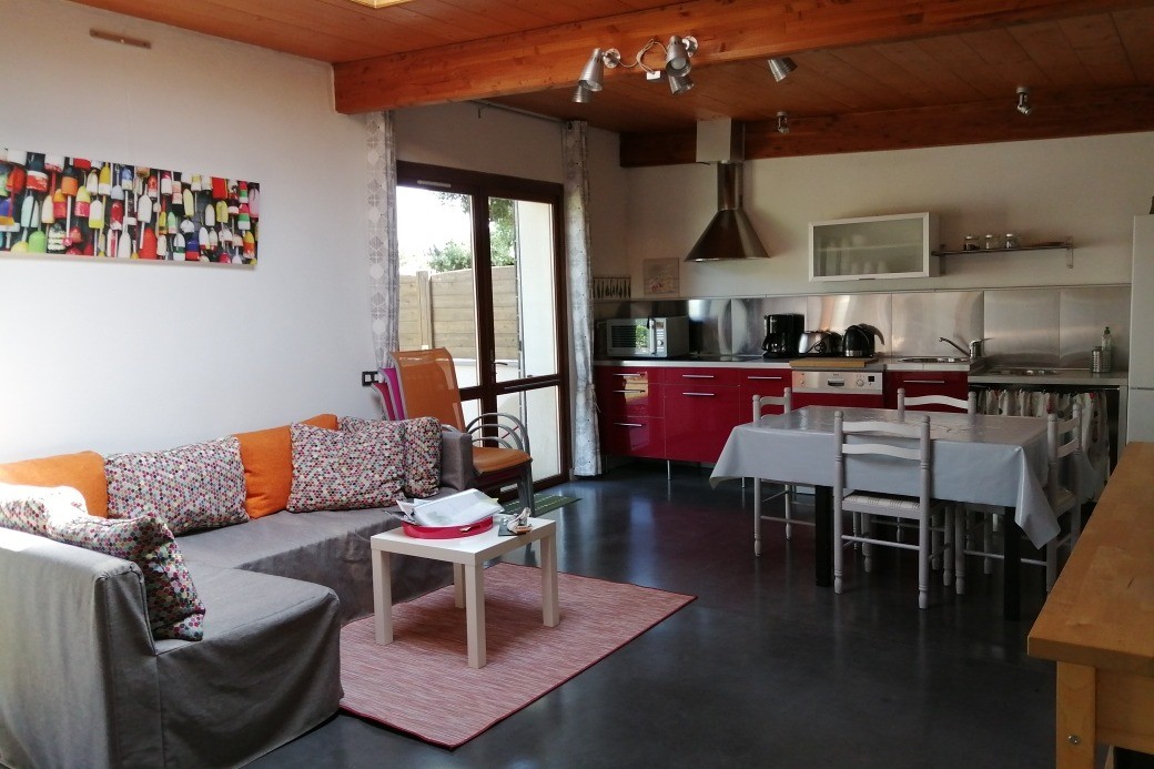 La pièce de vie est spacieuse et lumineuse, elle comporte une cuisine équipée, un coin repas et un espace détente TV.
