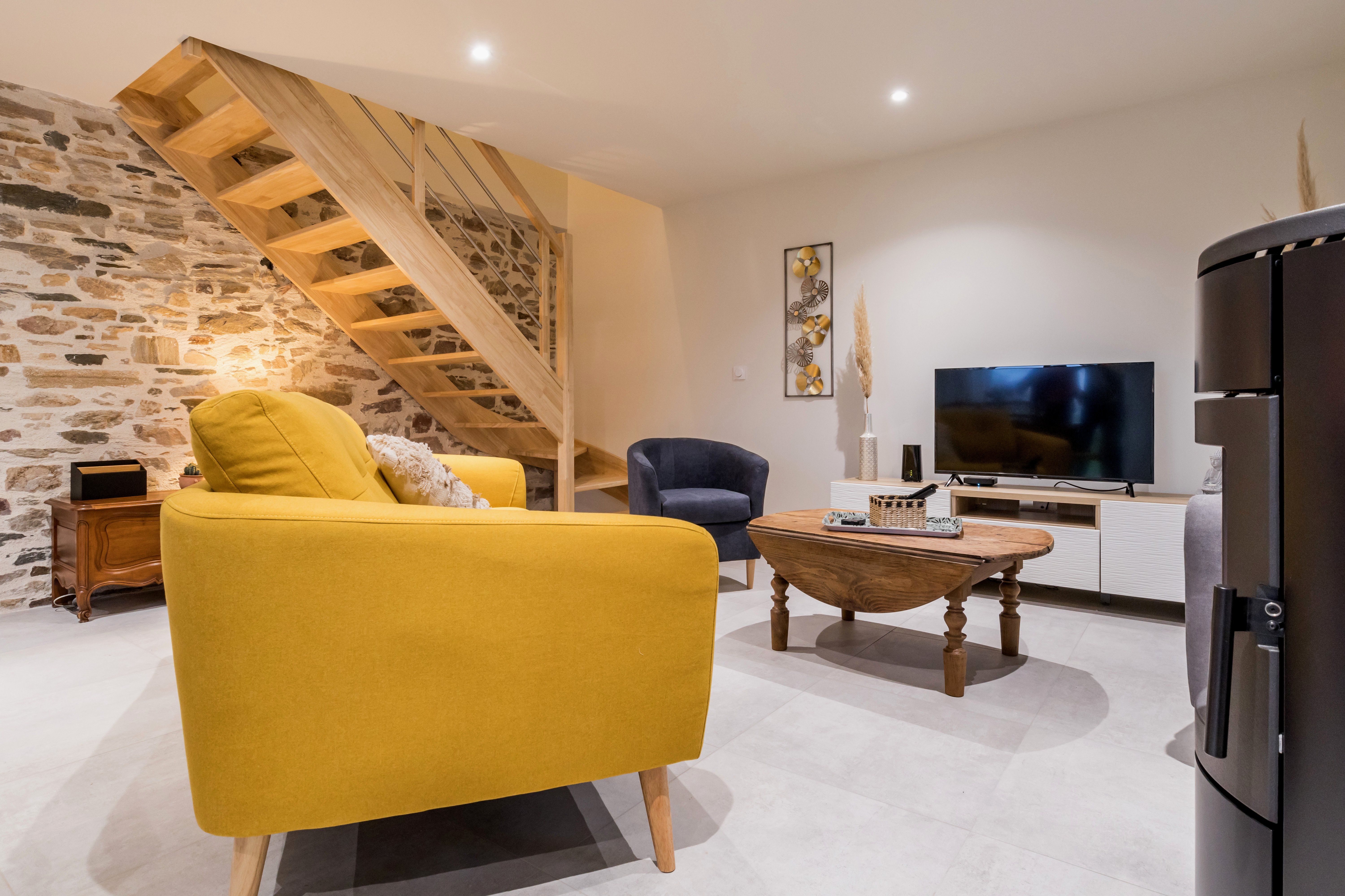 RDC: salon/séjour avec cuisine ouverte séparée, 1 chambre (lit 160x200) avec salle d'eau privative et WC indépendant.