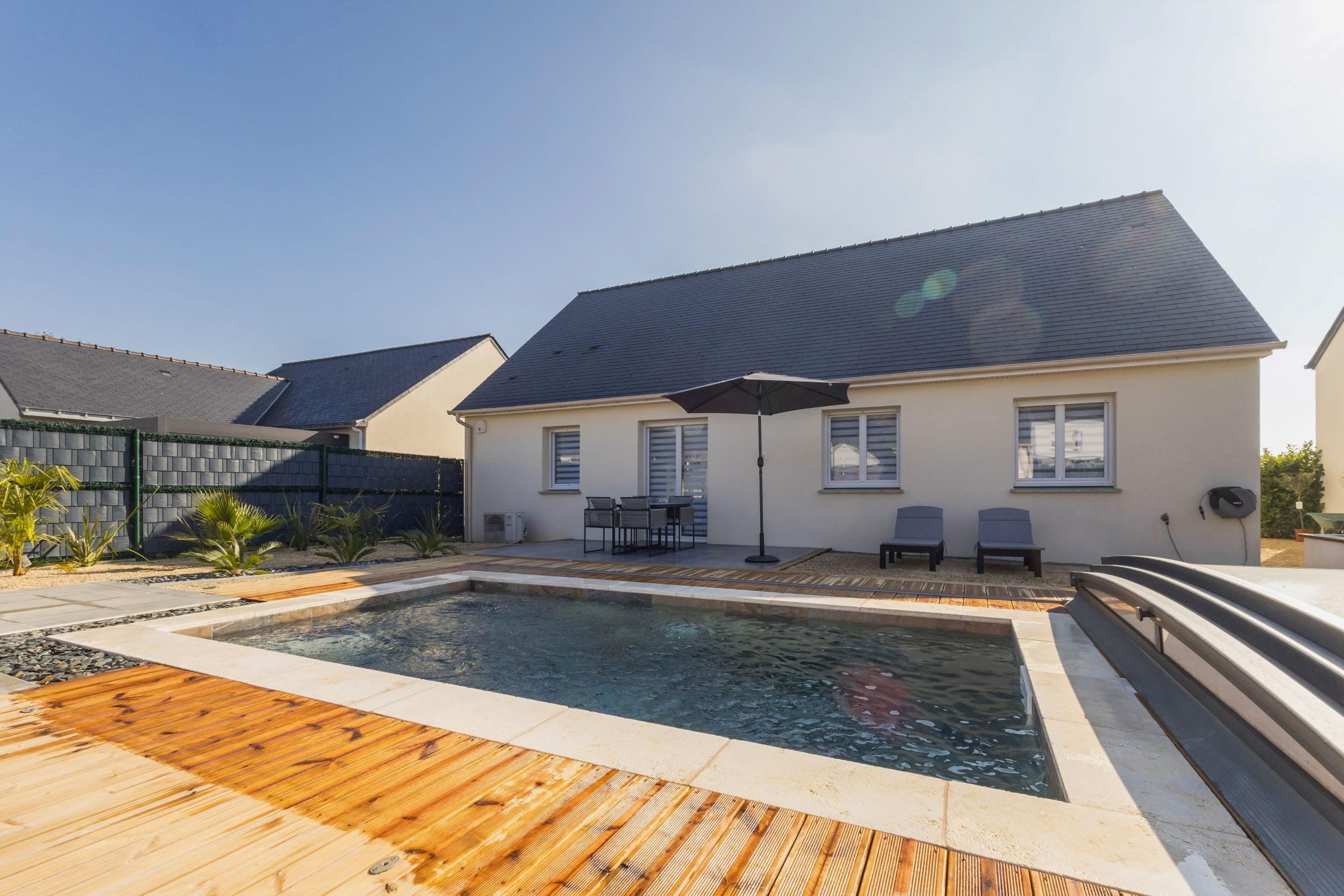 Jardin clos de 330 m² avec piscine couverte chauffée (10 m²) ouverte d'avril à octobre.